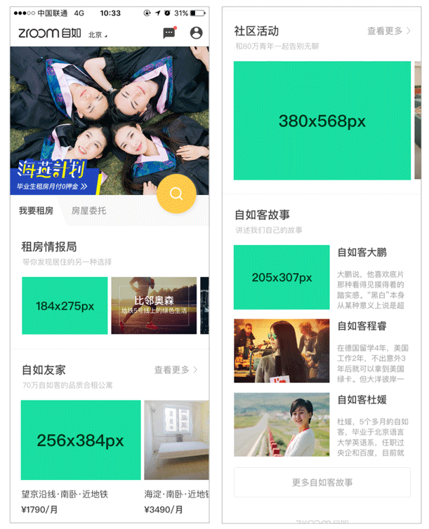 例如自如APP中的圖片,除了BANNER以外的其他圖片,雖然都有大有小尺寸都不同,但是所有的圖片的比例都是一樣的,長寬比例一樣讓我們可以猜想設計師是不是因為為了節約未來的維護成本,減少做圖及上傳圖片的次數而這么設計的。